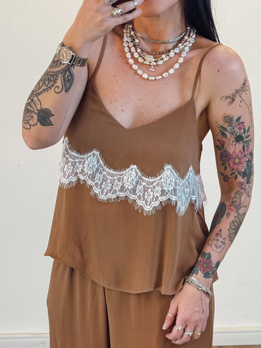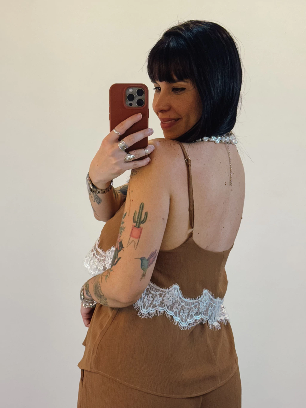 O Blusa Renda Toscana delicada e cheia de charme, tem alcinhas finas e reguláveis, que permite ajustar perfeitamente ao corpo, e um caimento solto que traz conforto e elegância na medida certa.