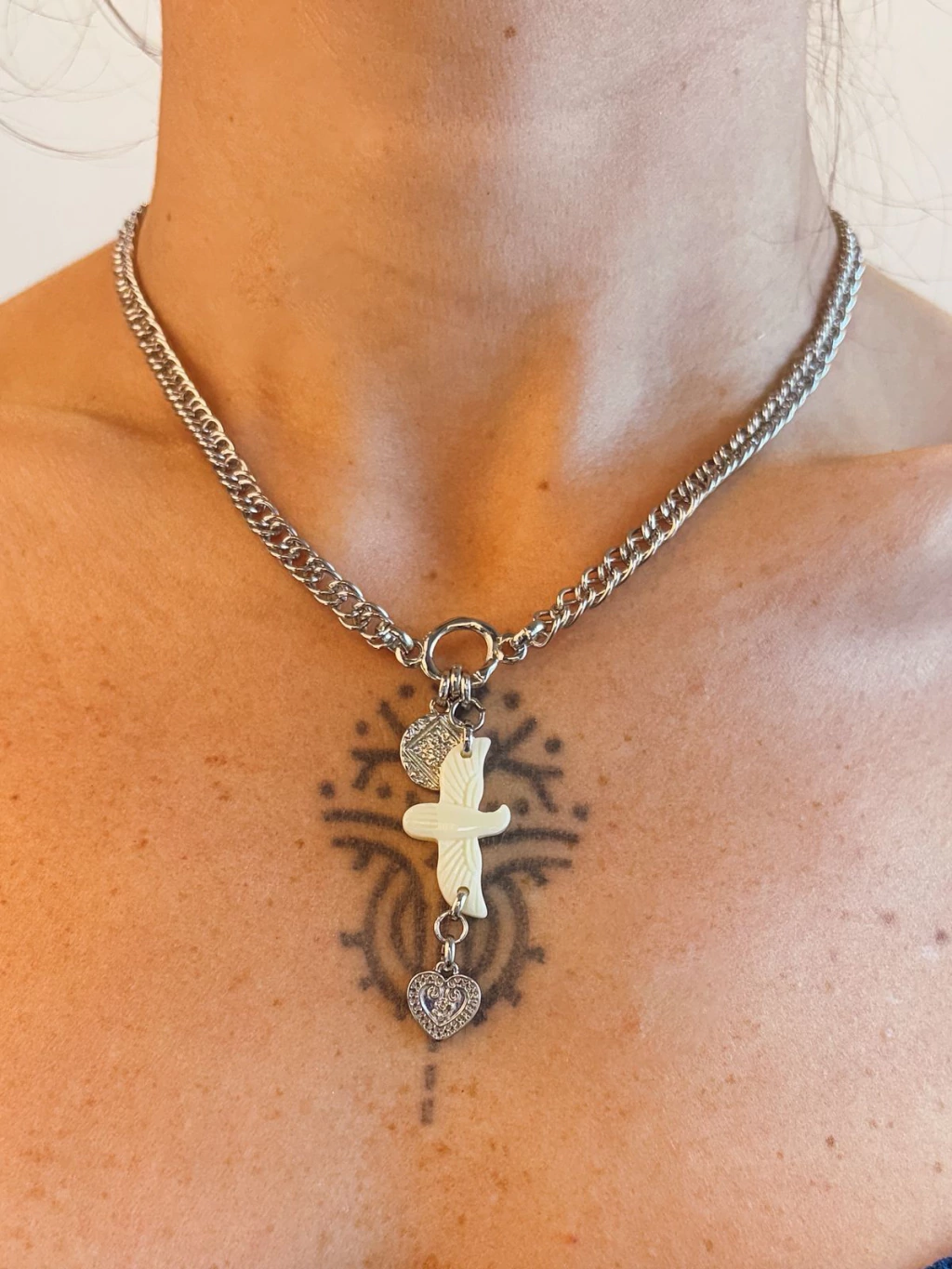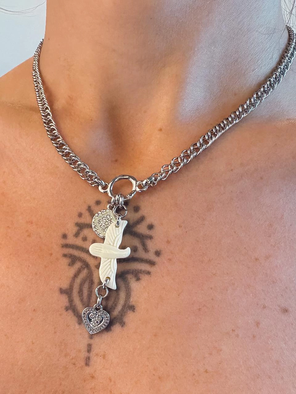 O colar amuleto é a expressão perfeita do equilíbrio entre sofisticação e força. Como elos alongados e acabamento com banho cataforético, ele garante brilho duradouro e resistência. Uma peça moderna e atemporal, que eleva qualquer produção com seu toque urbano e elegante. Comprimento 43cm.