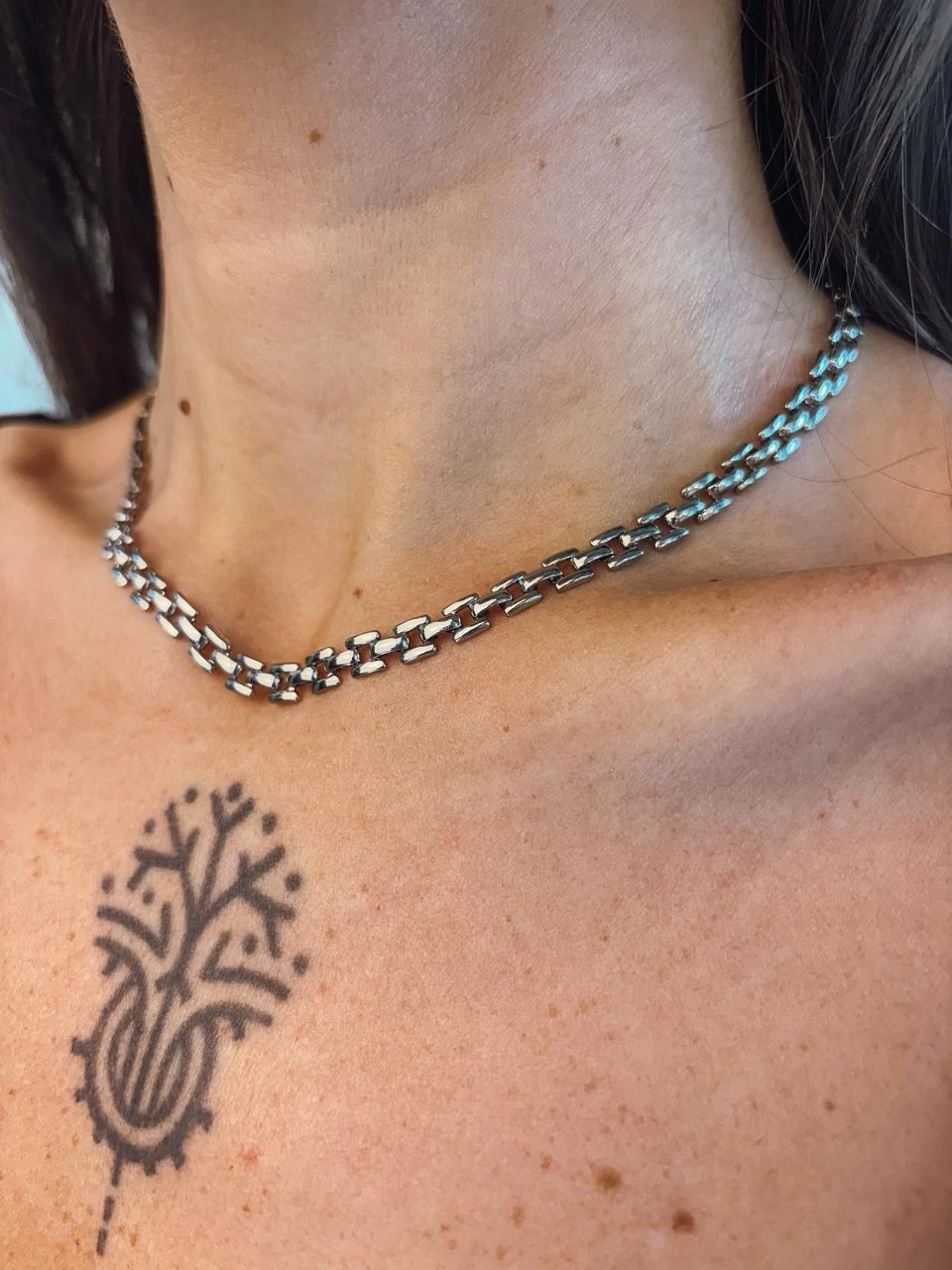 O colar Aura é a expressão perfeita do equilíbrio entre sofisticação e força. Como elos alongados e acabamento com banho cataforético, ele garante brilho duradouro e resistência. Uma peça moderna e atemporal, que eleva qualquer produção com seu toque urbano e elegante. Comprimento 43cm.