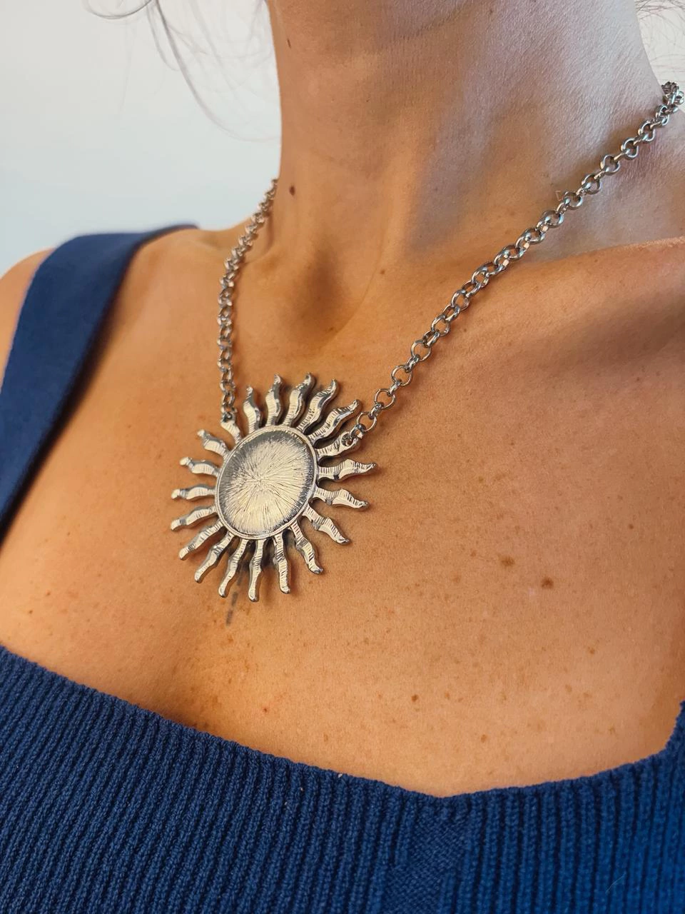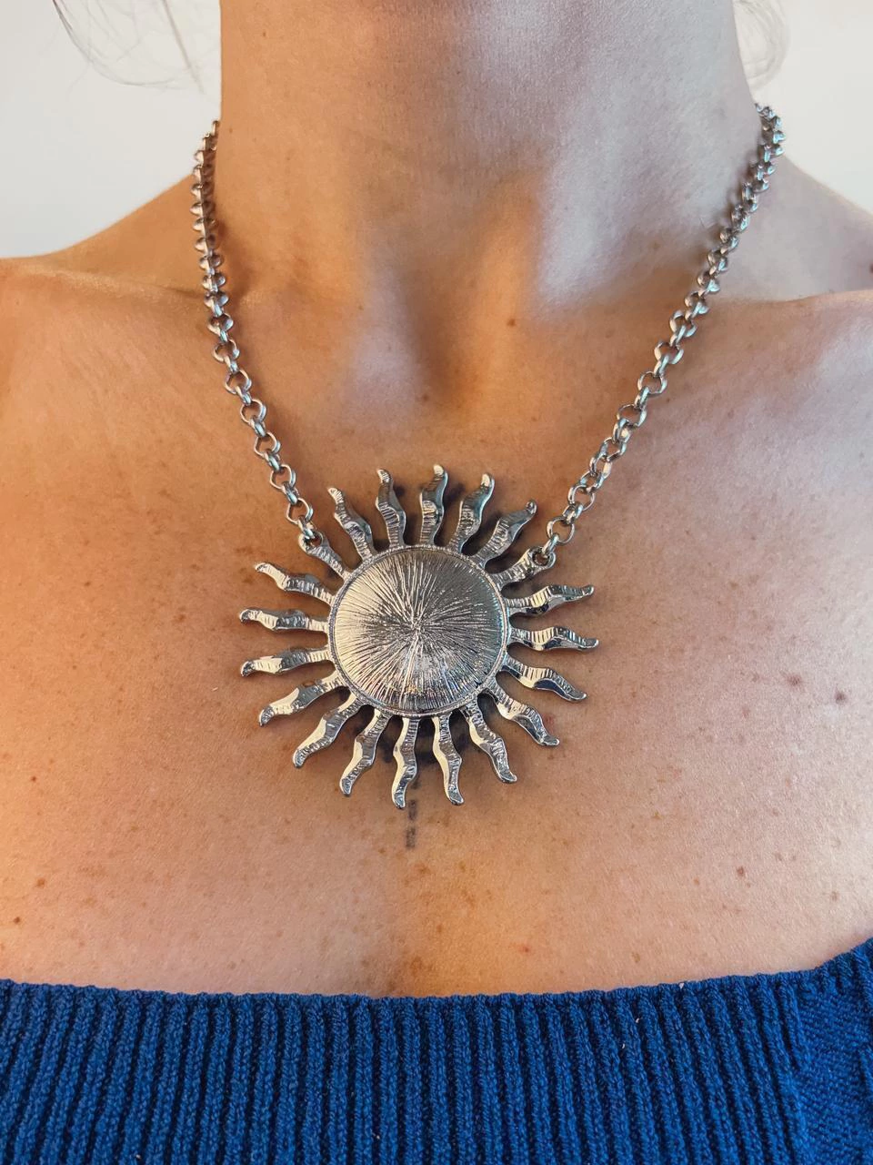 Imponente e cheio de personalidade, este colar traz uma corrente de malha robusta e um pingente em formato de sol com banho cataforético, que garante brilho intenso e acabamento duradouro. A mistura dos tons metálicos cria um visual marcante e contemporâneo, perfeito para quem gosta de acessórios com presença.
