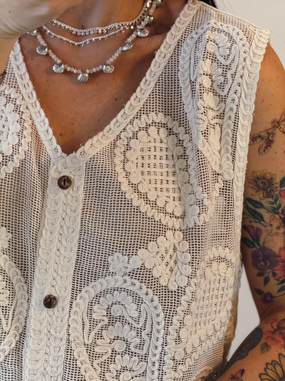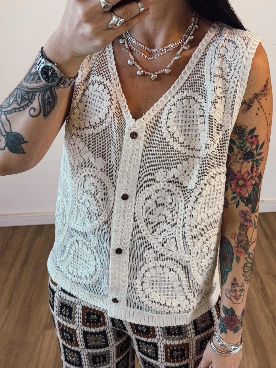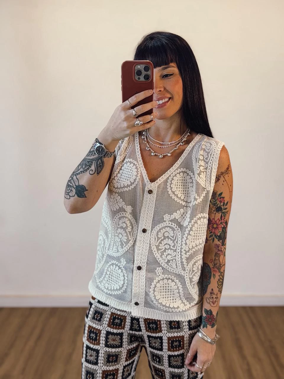 Colete Pipa traz um toque leve e despretensioso ao look. O modelo é um pouquinho mais comprido, garantindo caimento confortável e um visual moderno. Os botões frontais completam o estilo com um ar delicado e atemporal, perfeito para usar aberto sobre vestidos, regatas ou fechado com calça de cintura alta.
