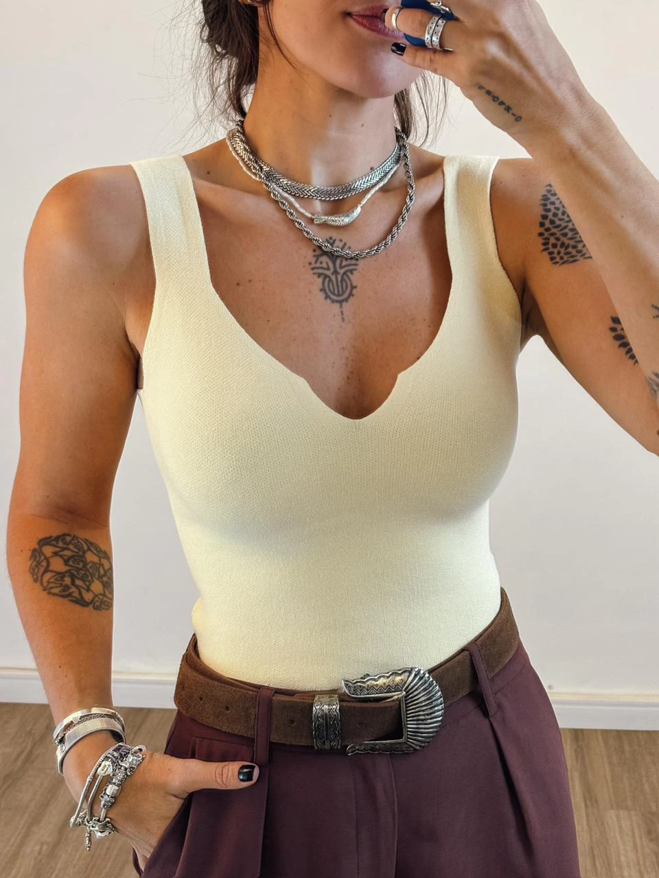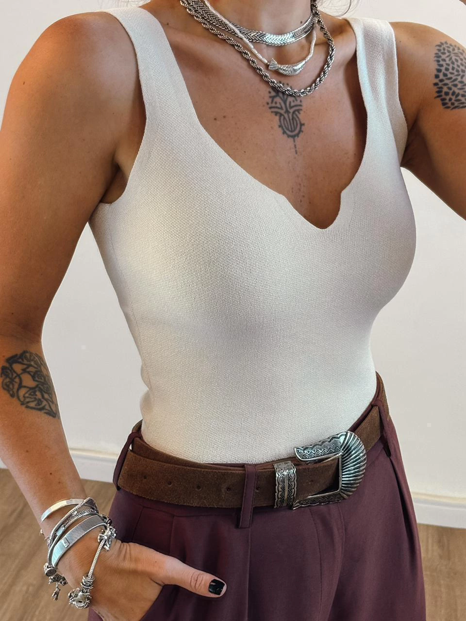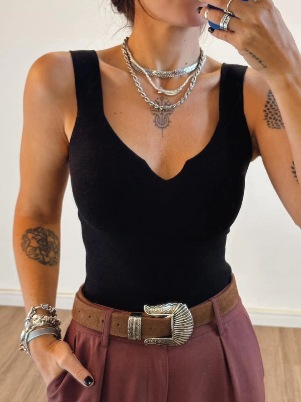Nosso cropped Aline é aquele básico nada óbvio que combina com tudo. Feito em tricô, tem toque macio, modelagem ajustada e decote em “V” que valoriza o colo na medida certa. O comprimento mais alongado permite usar com sutiã e compor tanto looks casuais quanto produções mais sofisticadas.